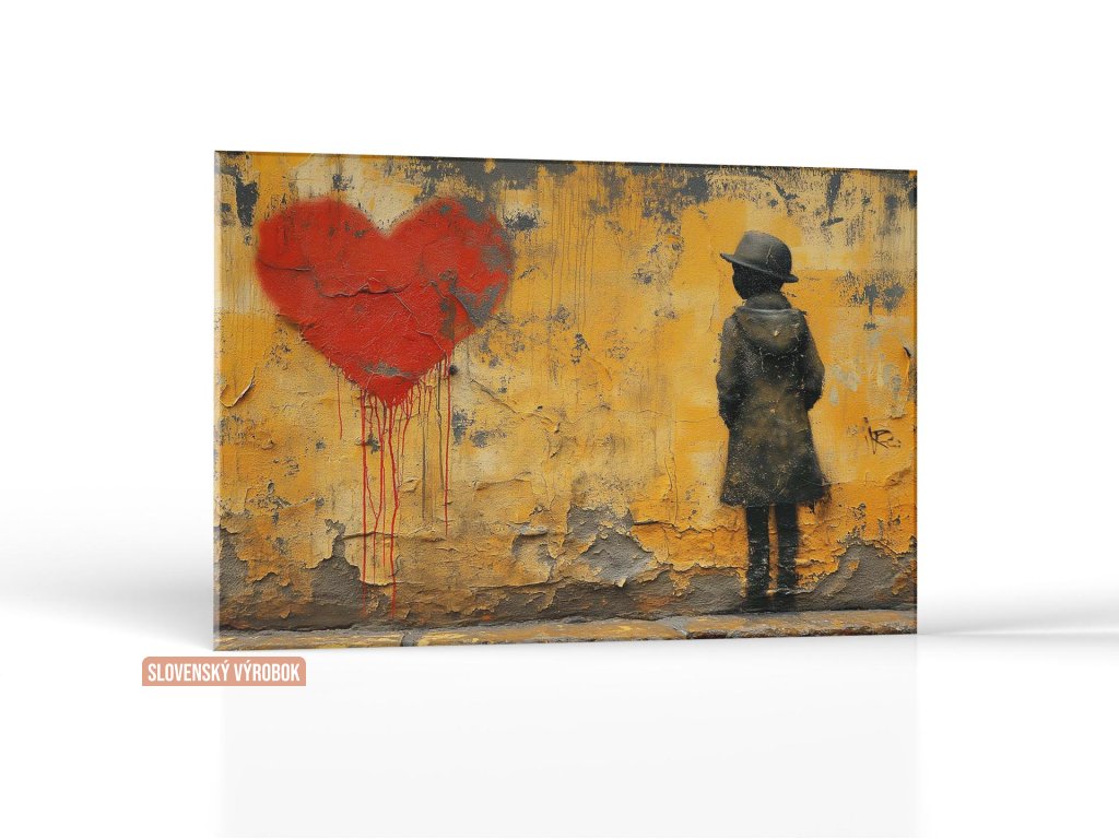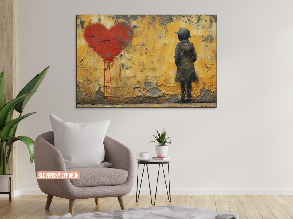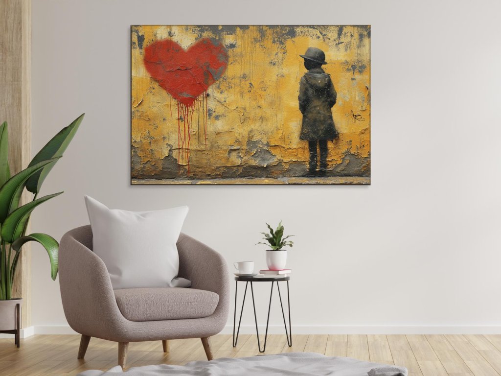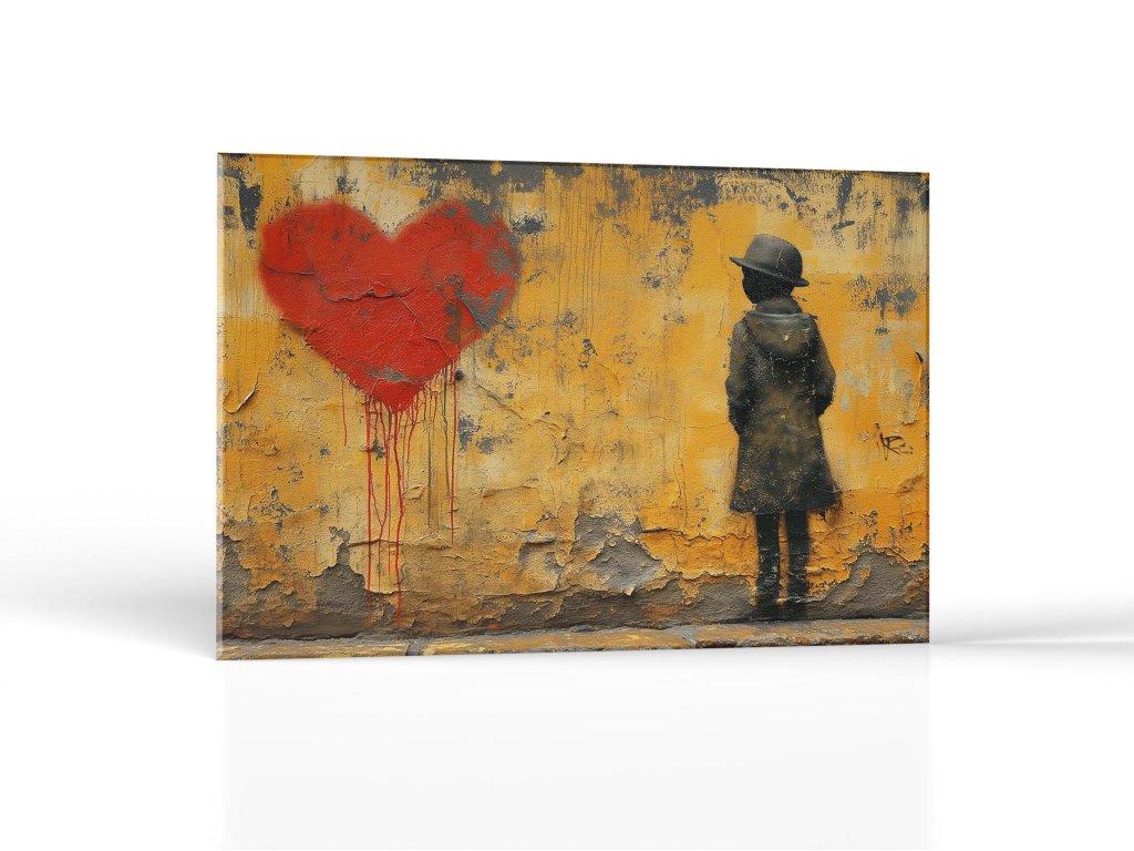 Na omietke steny je nástenná maľba zobrazujúca tajomnú postavu v klobúku, ktorá stojí oproti veľkému srdcu, ktoré sa zdá byť krvácajúcim. Postava vyzerá, že zamyslene pozoruje srdce, akoby bola súčasťou emotívneho alebo romantického príbehu. Farby a textúry vytvárajú silný vizuálny dojem, ktorý zdôrazňuje kontrast medzi starou stenou a živými farbami umenia.