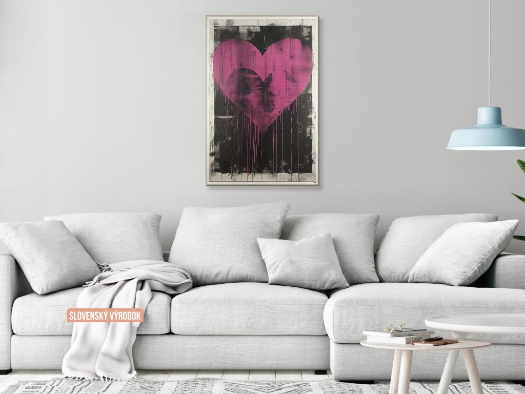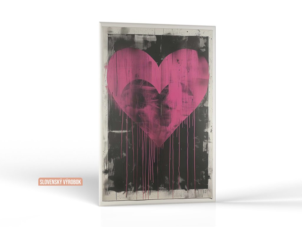 Obrázok zobrazuje ružové srdce načrtnuté na špinavom tmavom pozadí, symbolizujúce krásu a bolesť v láske. Drip art technika, kde farba steká z objektu, dodáva emotívny dotyk. Kontrast medzi živou ružovou a potlačenými tmavými odtieňmi vytvára dojem hlbokej emócie a vášne.