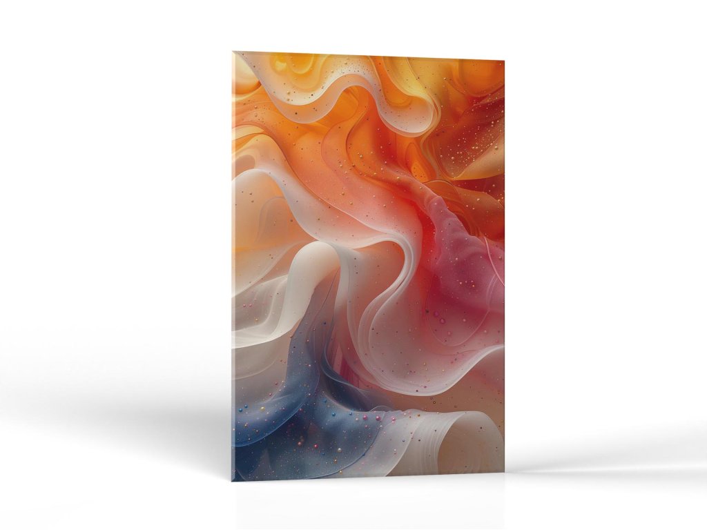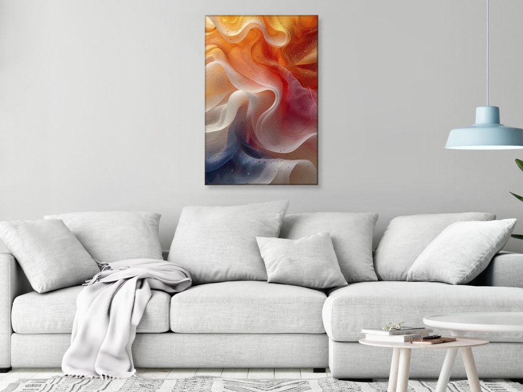 Obraz s plynulými abstraktnými tvarmi v teplých a studených odtieňoch s jemnými kvapkami.