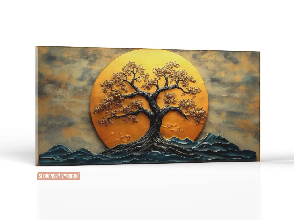 Tento obraz zachytáva mohutný strom, ktorý sa hrdo týči pred obrovským zlatým slnkom. Vetvy stromu sú prepletené a rozprestierajú sa do všetkých strán, zatiaľ čo slnko za ním osvetľuje celý obraz teplými odtieňmi zlatej. V popredí sa rysujú modré vrchy, ktoré dodávajú kompozícii hĺbku a vytvárajú pocit pokoja a nadčasovosti.