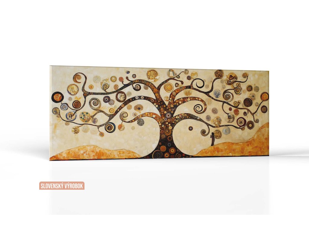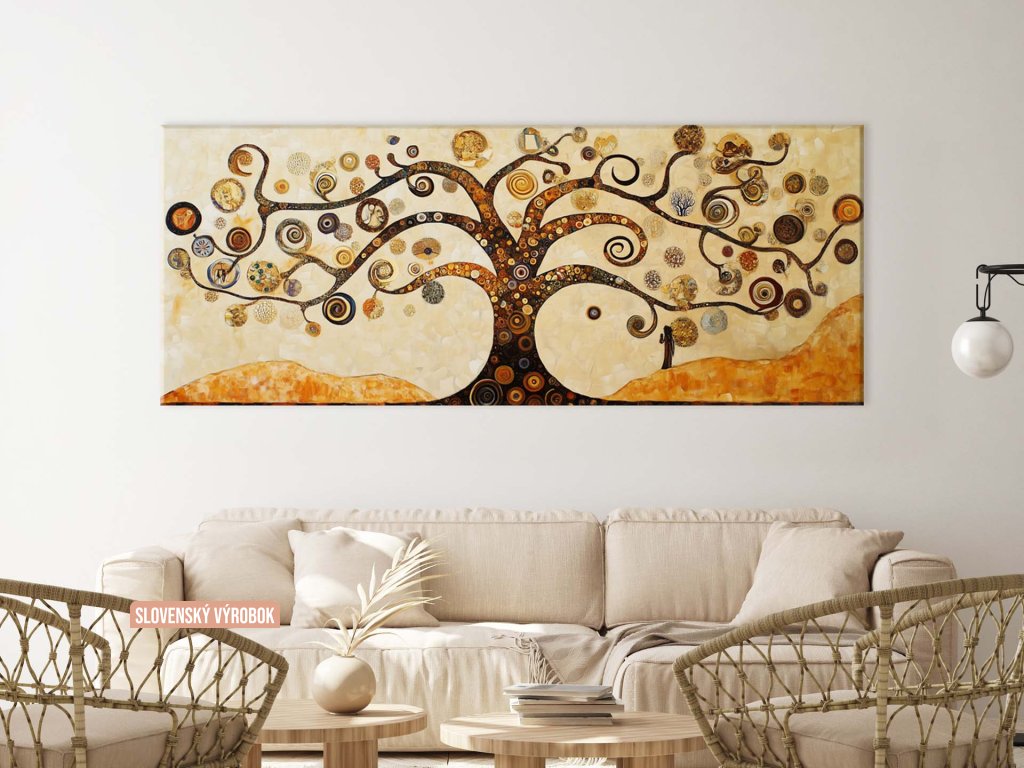 Tento obraz znázorňuje strom života, ktorého vetvy sa rozvetvujú do umelecky prepracovaných špirál a ornamentov. Každá vetva nesie kruhové symboly predstavujúce rôzne etapy života, harmóniu a nekonečno. Zlaté tóny a jemné textúry dodávajú obrazu pocit luxusu a hlbokého duchovného významu.