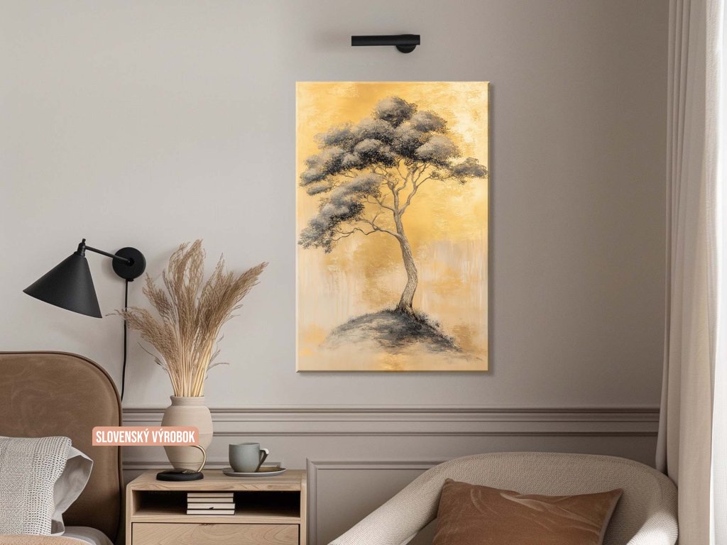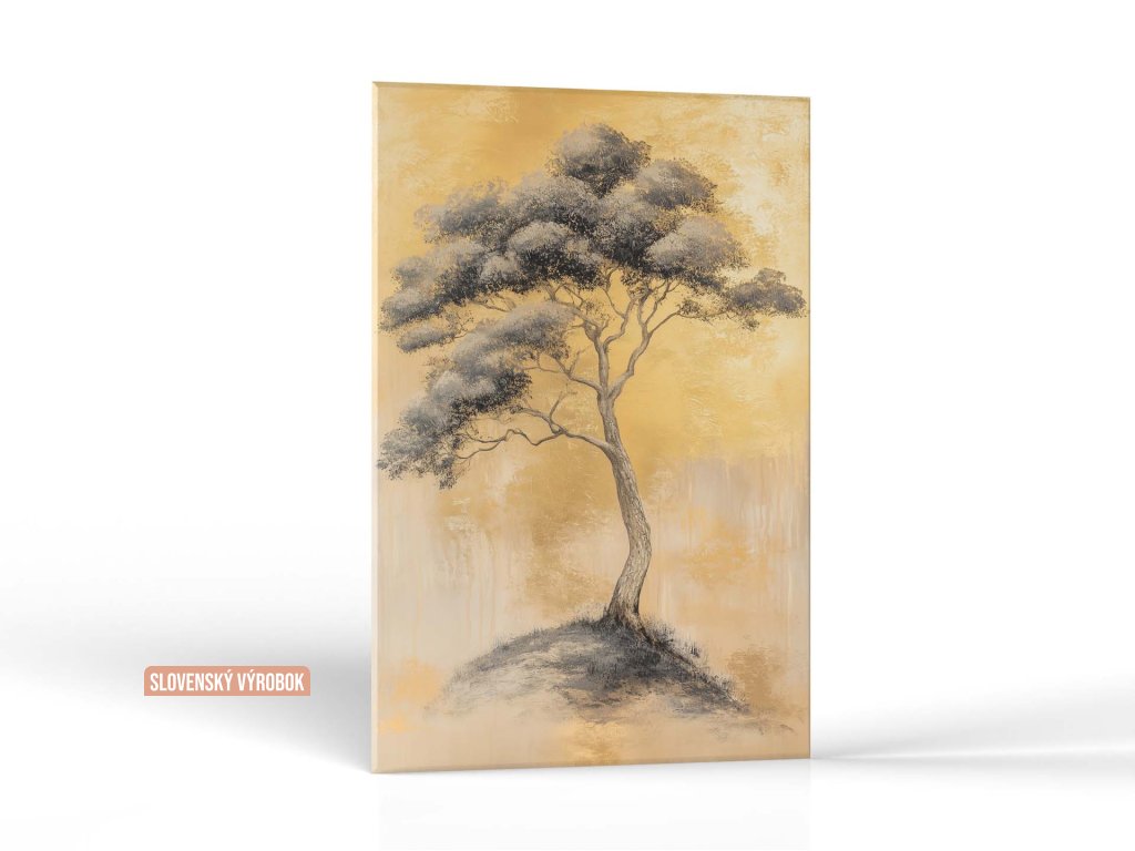 Obraz zobrazuje elegantný strom s hustou korunou na vrchole malého kopca, kde je každý detail starostlivo vykreslený. Pozadie je jemne textúrované zlatou farbou, ktorá dodáva obrazu teplo a pokoj. Strom samotný pôsobí ako symbol prírody a večnosti, harmonicky vynikajúci v minimalistickej kompozícii.