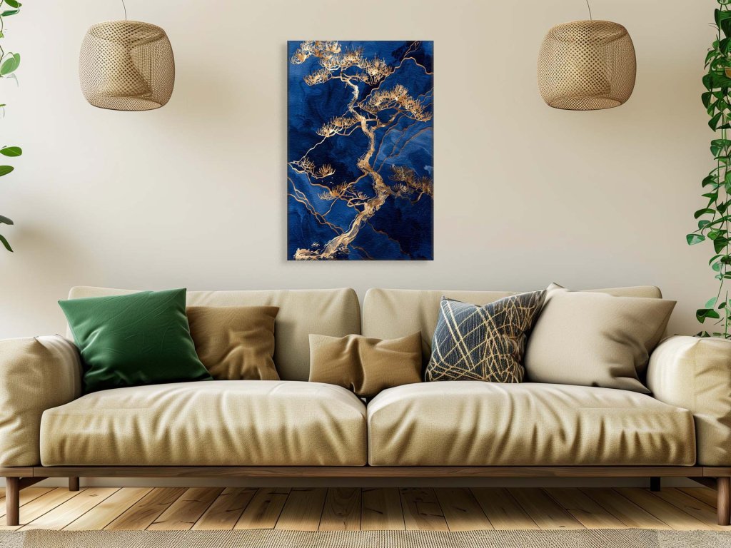 Na obraze je zobrazený vetvistý strom s konármi v zlatých a bielych odtieňoch, ktorý sa vypína na výraznom tmavomodrom pozadí. Detaily a textúry na strome evokujú pocit životnosti a prírodnej krásy, zatiaľ čo modrá plocha pripomína hlboké vody oceánu alebo nočnú oblohu. Tento kontrast farieb vytvára dramatický vizuálny efekt, ktorý zvýrazňuje eleganciu a komplexnosť prírodných foriem.