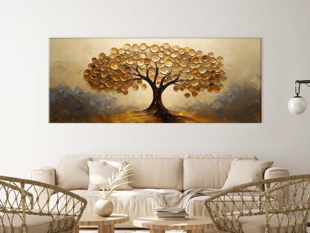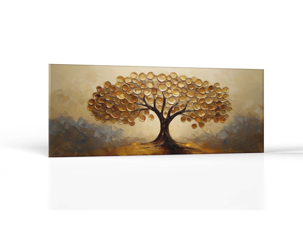 Obraz zobrazuje mohutný strom, ktorého vetvy sú zdobené žiarivými zlatými kruhmi, pripomínajúcimi mince alebo slnečné odlesky. Strom je zasadený v krajine s jemnými, rozmazanými kontúrami, ktoré zvýrazňujú jeho majestátnosť. Použité teplé farby a textúrovaný povrch obrazu vytvárajú atmosféru hojnosti a harmónie.