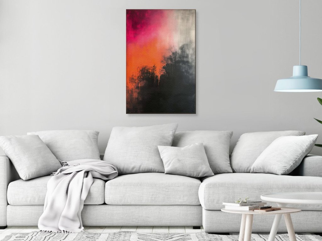 Tento obraz predstavuje abstraktnú kompozíciu, v ktorej žiarivé červené a oranžové odtiene prechádzajú do hlbokých čiernych tónov, vytvárajúc pocit západu slnka nad tmavým morom alebo horizontom. Dynamické ťahy štetca a stekajúce farby dodávajú práci energiu a hĺbku, zatiaľ čo zmiešané textúry a prechody farieb evokujú pocit pohybu a zmeny.