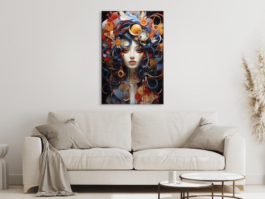 Obraz predstavuje ženu s modrými vlasmi a živými červenými perami. Jej vlasová koruna je zdobená geometrickými tvarmi, kruhmi a mechanickými súčiastkami, ktoré vytvárajú surrealistický efekt. Farby sú bohaté a dynamické, s dominantnými odtieňmi modrej, oranžovej a červenej.