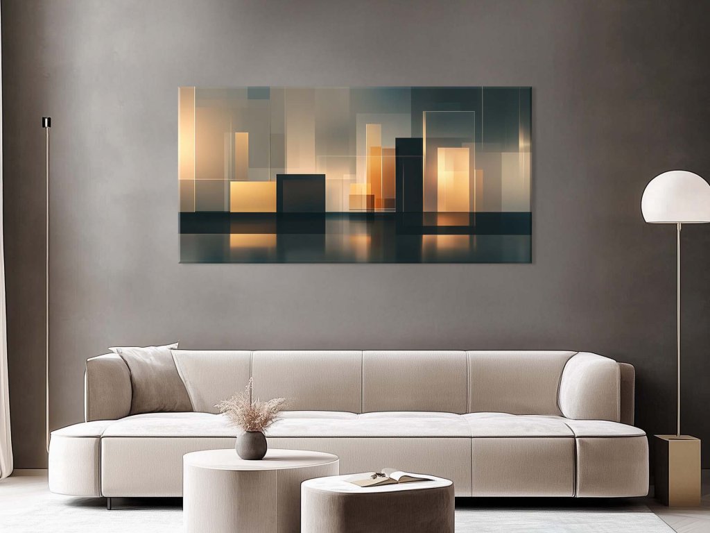 Tento obraz predstavuje abstraktné geometrické tvary, ktoré sa navzájom prelínajú a vytvárajú dojem hĺbky a priestoru. Teplé tóny svetla v kombinácii s tmavými tieňmi dodávajú obrazu vyváženú eleganciu a pokoj. Je to moderný umelecký kúsok, ktorý by svojím minimalizmom oživil akýkoľvek interiér.