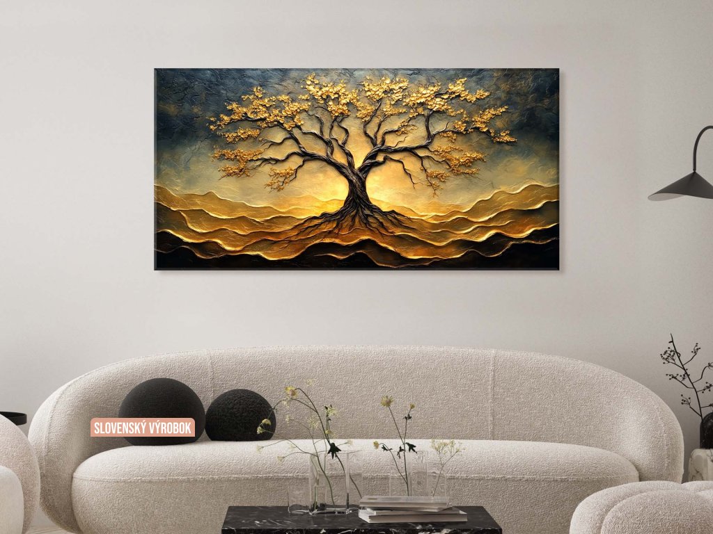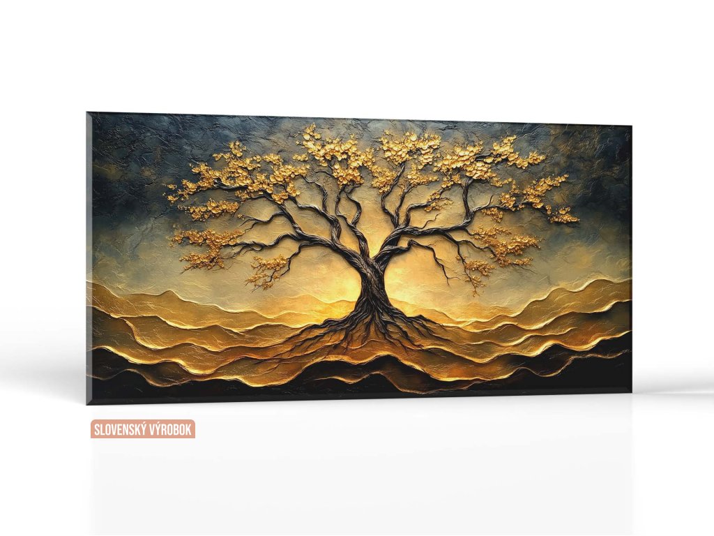 Tento obraz zobrazuje mohutný strom s rozvetvenou korunou plnou zlatistých listov, ktoré žiaria v kontraste s temným pozadím. Kmeň a korene pôsobia silne a pevne, akoby čerpali silu z vrstveného, tajomného podložia. Celková kompozícia evokuje nadprirodzenú silu prírody, večný cyklus života a nádej žiariacu aj v tme.