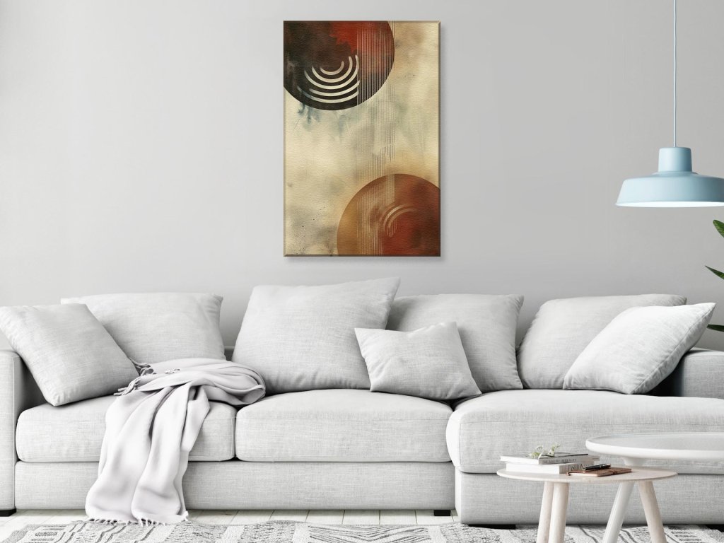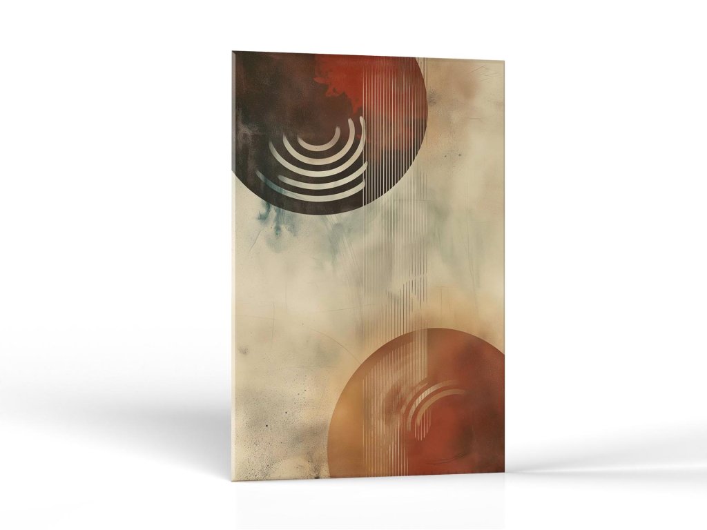 Na obraze je zobrazená štýlová kompozícia s dominantnými kruhmi a linkami. Vrchná časť je v tmavých tónoch s červenou a čiernou, zatiaľ čo spodná časť plynule prechádza do teplých hnedých a béžových odtieňov. Línie na obraze sú vertikálne a vytvárajú pocit rytmu a pohybu. Celkový dojem je moderný a minimalistický, no zároveň evokuje hlbokú atmosféru.