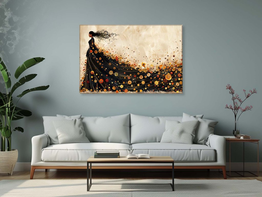 Na tomto obraze je žena oblečená v dlhom čiernom šate, ktorý sa mení na bujný kvetinový výbuch. Vlasy ženy sa rozplývajú vo vetre a šaty vytvárajú dojem, že sa rozpúšťajú do okolitého prostredia. Tento obraz je vizuálnou poéziou pohybu a prírody, pričom kombinuje prvky realizmu a fantázie.