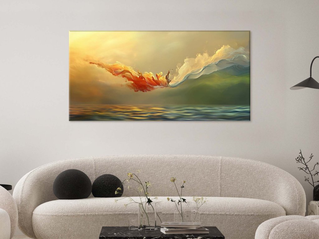Obraz zachytáva fascinujúcu symbiózu ohňa a vody, ktoré sa stretávajú v magickom tanci nad hladinou oceánu. Žiarivo oranžové plamene sa miešajú s chladnou modro-zelenou vlnou, pričom vytvárajú dojem neustáleho pohybu a premeny. Svetlo, ktoré padá na scénu, umocňuje dramatickú atmosféru a dodáva kompozícii nový, takmer surrealistický nádych.