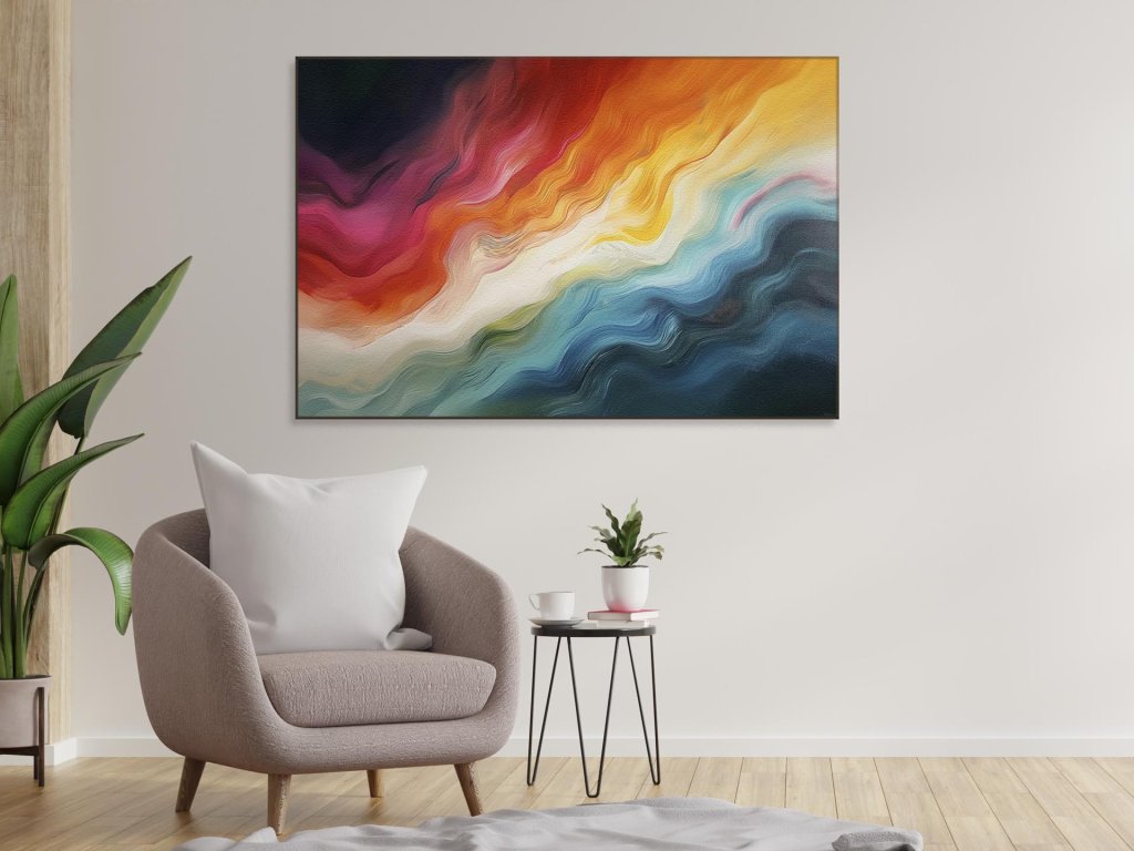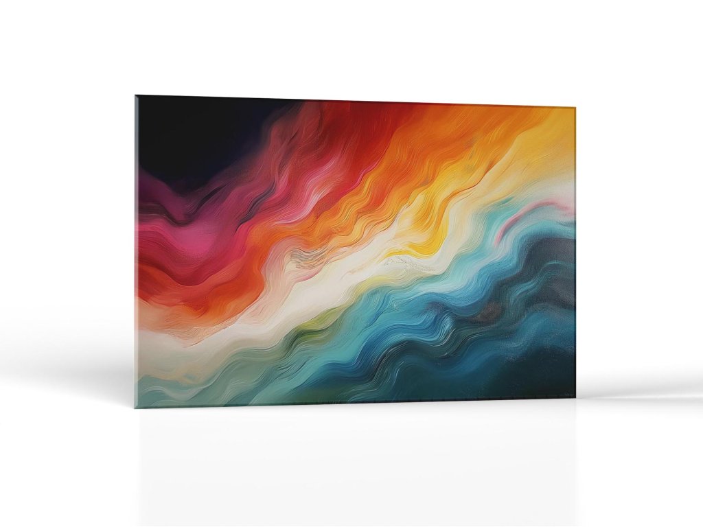 Obraz zachytáva dynamický a plynulý prechod farieb, od intenzívnych červených a oranžových odtieňov až po pokojné modré a zelené tóny, čo vyvoláva dojem tanca ohňa a vody. Abstraktné formy na obraze evokujú spontánnosť a pohyb, pričom divák má možnosť vnímať umelecké dielo cez vlastné emócie a interpretácie.