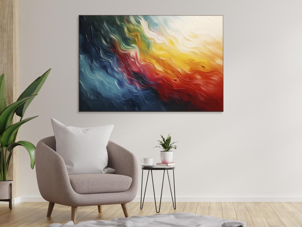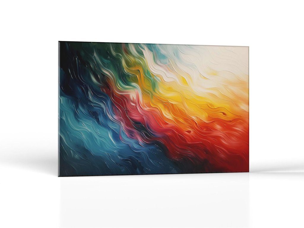 Na obraze vidíme živý výjav vlniacich sa farieb, kde intenzívne červené, oranžové a žlté tóny symbolizujú teplo a energiu, zatiaľ čo modré a zelené odlesky vyvolávajú pocit chladu a pokoja. Tieto prúdy farieb sa preplietajú a vytvárajú dojem horúceho vzduchu stúpajúceho nad chladnou vodnou plochou, čo nám umožňuje zakúsiť vizuálne zobrazenie teplotných kontrastov.