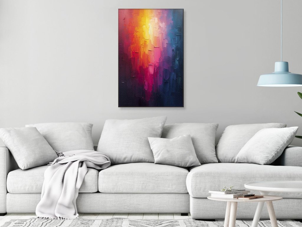 Vertikálne pásy akrylových farieb s prechodom od teplých po chladné tóny.