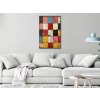 Tento abstraktný obrázok je kolážou obdĺžnikov, každý s unikátnou textúrou rozpraskaných farieb, od tmavých odtieňov až po žiarivé tóny. Praskliny a známky opotrebenia na každom štvorci dodávajú dielu autentický vzhľad, evokujúci stenu s odlupujúcou sa farbou. Celkový efekt je rustikálny a priemyselný, čo dáva dielu výraznú estetickú silu.