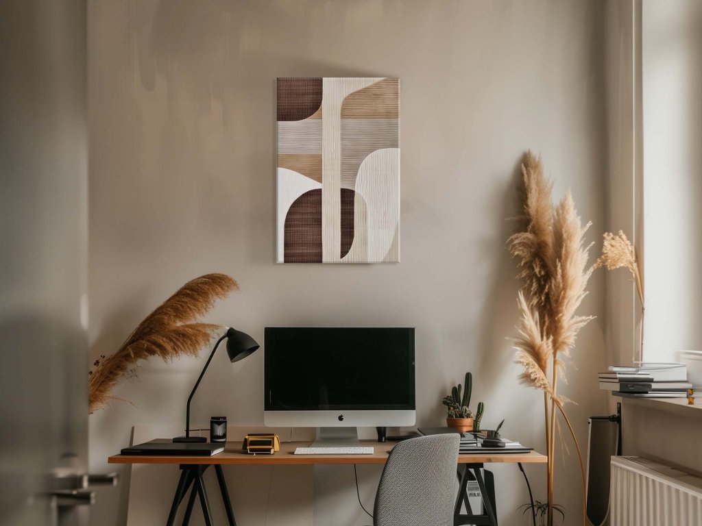 Tento obraz zachytáva hru textúr a geometrických tvarov, ktoré sú vyjadrené v jemných neutrálnych odtieňoch. Kompozícia obrazu vytvára vizuálnu harmóniu, pričom rôzne textúry a vzory dodávajú dielu hĺbku a dynamiku. Celkový efekt je upokojujúci a elegantný, čím obraz vyniká ako sofistikovaný dekoratívny prvok.