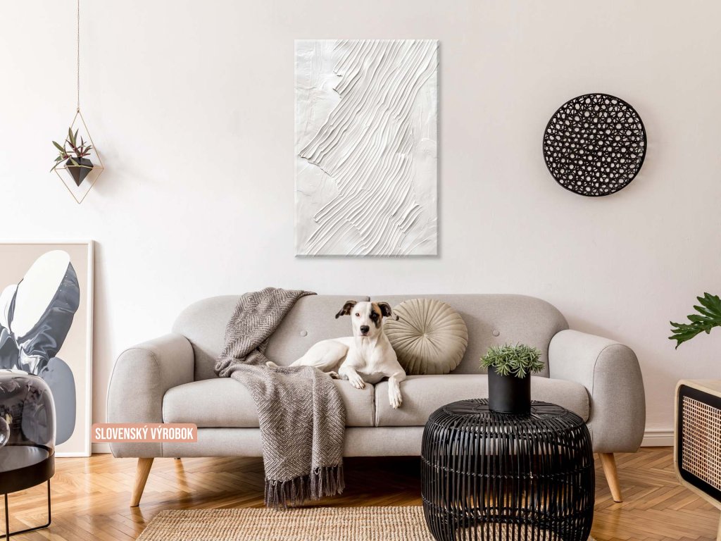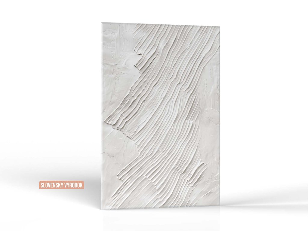 Tento obraz zobrazuje abstraktné textúrované línie v jemných odtieňoch bielej, ktoré vytvárajú dojem hĺbky a pohybu. Línie sú usporiadané v dynamickom a plynulom vzore, čo dodáva kompozícii pocit kontinuity a rytmu. Ilustrácia má moderný a minimalistický vzhľad, ktorý sa hodí do interiérov s dôrazom na čisté línie a subtílne farebné palety.