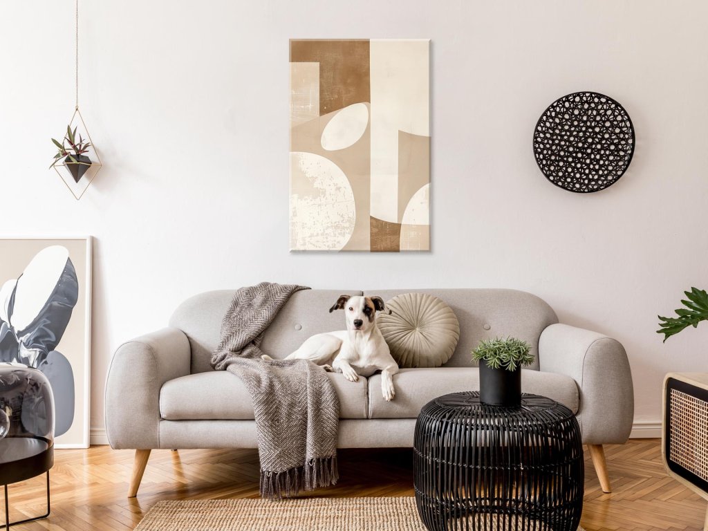 Tento abstraktný obraz využíva jemné béžové a biele odtiene na vytvorenie pokojnej a harmonickej kompozície geometrických tvarov. Kruhy, ovály a obdĺžniky sú usporiadané tak, aby vyvolávali pocit rovnováhy a ticha. Jednoduchosť a čistota farebnej palety dodávajú obrazu minimalistický, no zároveň sofistikovaný vzhľad.