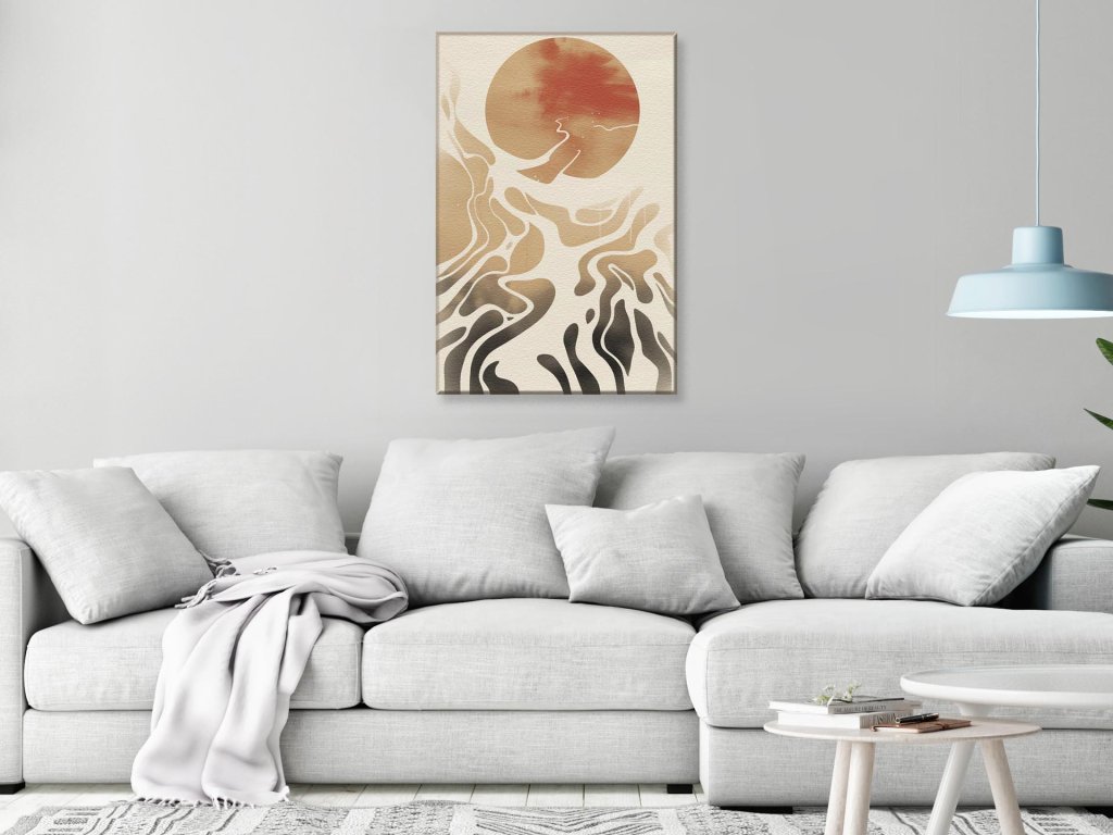 Tento obraz, nazvaný "Tiché popoludnie", predstavuje abstraktnú interpretáciu prírodných prvkov a ich pokoja. Dominantný červený kruh, ktorý môže predstavovať slnko, je zakomponovaný do plynulej krajiny bielych a hnedých tónov, pripomínajúcich pohyby vzdušných prúdov alebo tečúcej vody. Dynamika a zároveň harmónia obrazu vytvárajú dojem ticha a odpočinku, čo diváka vedie k premýšľaniu o cykloch prírody a nekonečnom toku času.