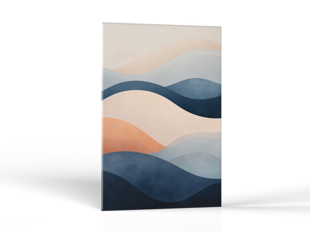 Abstraktné vrstvy jemných vĺn v tlmených odtieňoch modrej, béžovej a oranžovej.
