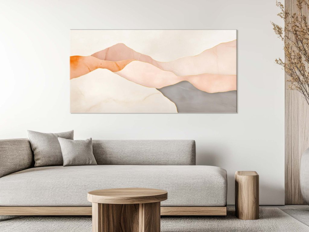 Obraz zobrazuje abstraktné pásy farieb, ktoré evokujú horizonty krajiny, vrstvy pôdy alebo pohoria. Použité tóny – tehlová, béžová, ružová a sivá – pôsobia zemitým a upokojujúcim dojmom. Zlato zvýraznené línie dodávajú dielu eleganciu a jemný lesk, vďaka čomu pôsobí štýlovo a harmonicky.