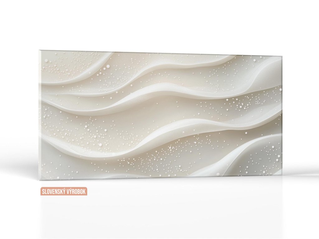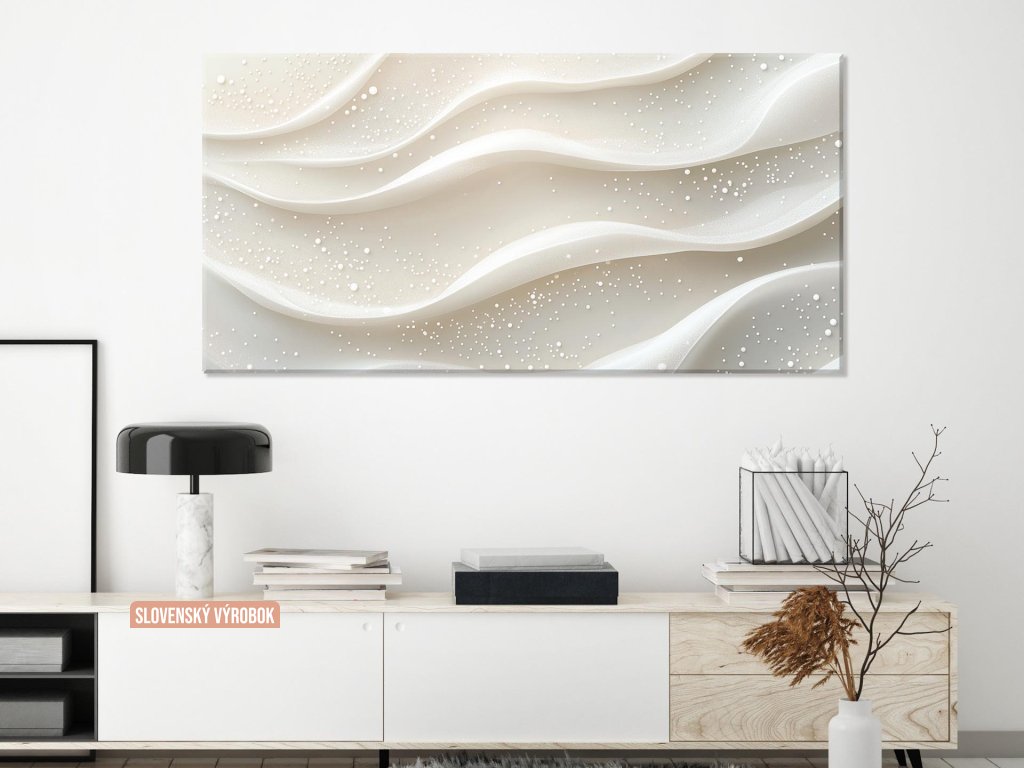 Obraz zachytáva abstraktné krivky pripomínajúce plynulé záhyby hodvábu, ktoré navodzujú pocit jemnosti a ladnosti. Svetlé tóny bielej a krémovej farby sú prežiarené drobnými bodkami, evokujúcimi snehové vločky alebo perly. Kompozícia pôsobí čisto, elegantne a vyvoláva dojem nadpozemského pokoja.