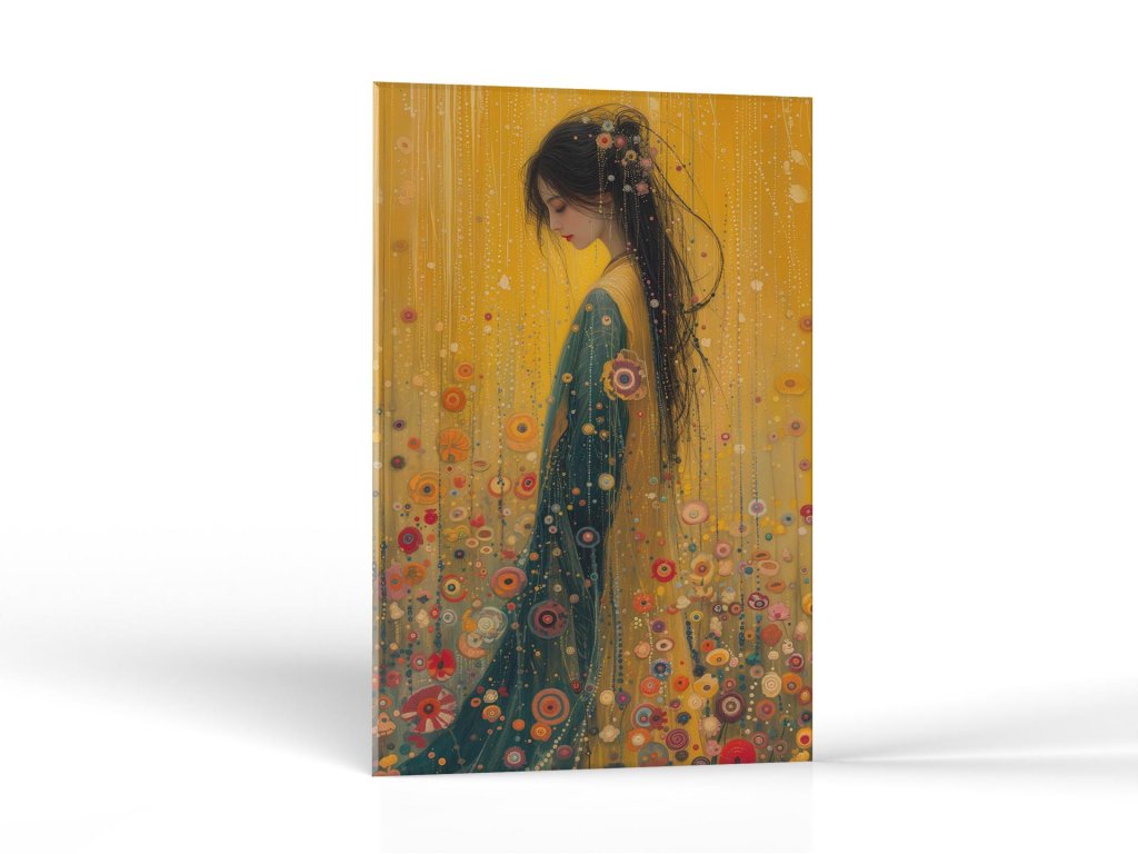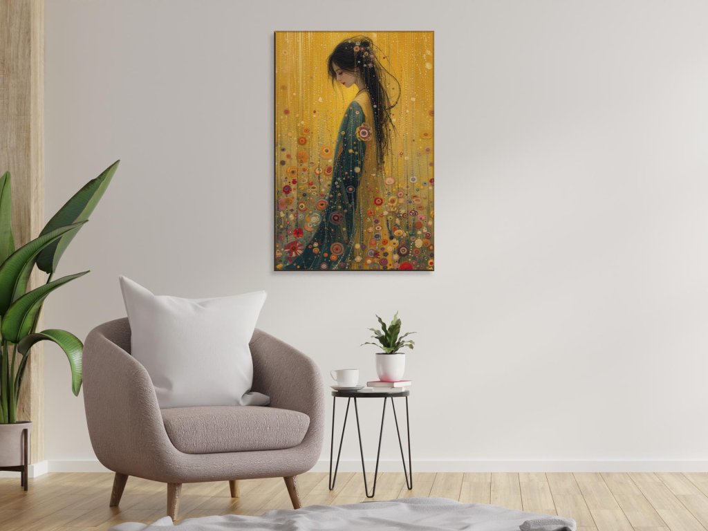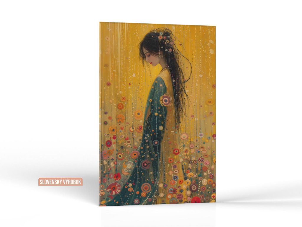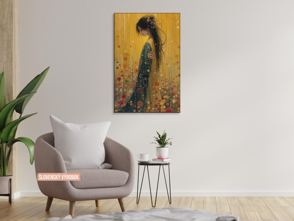 Na obraze je zobrazená žena z profilu, hľadiaca do zeme. Jej dlhé čierne vlasy sú zdobené farebnými kvetmi a perličkami, čo ladí s bohato zdobenými šatmi, pripomínajúcimi mozaiku. Pozadie obrazu je rozprávkovo abstraktné, s množstvom kruhov a bodiek v jasných farbách na zlatistom pozadí.