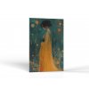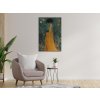 Mladá žena s tmavými vlasmi stojí bokom, zahĺbená do svojich myšlienok. Jej dlhý šat s nádhernými vzormi evokuje mozaikové umenie a kontrastuje s tmavomodrým pozadím. Obraz pôsobí pokojne a meditatívne, s využitím bohatých textúr a farebných akcentov.