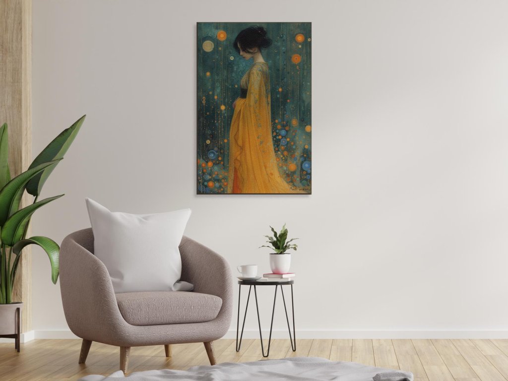 Mladá žena s tmavými vlasmi stojí bokom, zahĺbená do svojich myšlienok. Jej dlhý šat s nádhernými vzormi evokuje mozaikové umenie a kontrastuje s tmavomodrým pozadím. Obraz pôsobí pokojne a meditatívne, s využitím bohatých textúr a farebných akcentov.