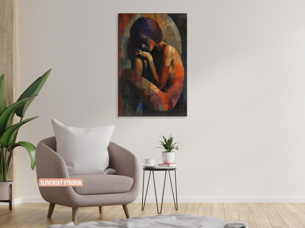 Portrét ženy sediacej v zhrbenej pozícii, hlava je opretá o ruku, čo naznačuje úvahy alebo smútok. Je znázornená v štýle, ktorý pripomína mozaiku, s prevažujúcimi teplými oranžovými a hnedými tónmi a akcentmi chladných odtieňov. Pozadie a odev postavy sú rozdelené do geometrických segmentov, čo dodáva dielu moderný výraz.
