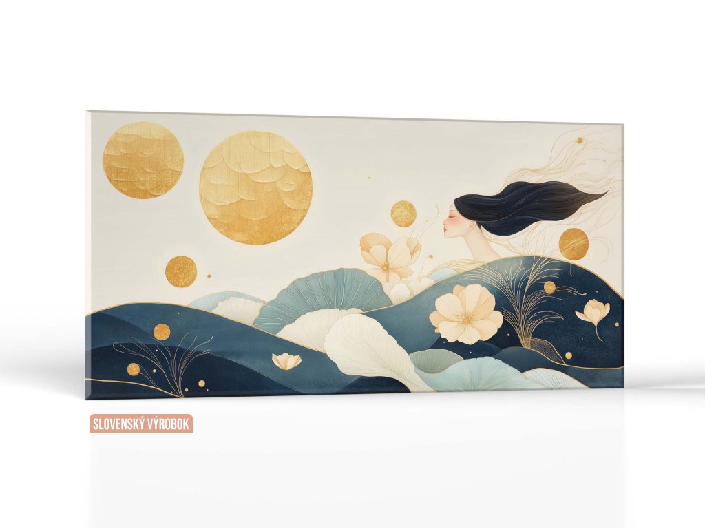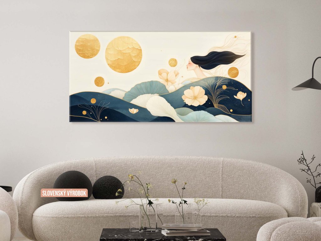 Ilustrácia zobrazuje ženu s plynúcimi čiernymi vlasmi, ktorá sa vznáša nad abstraktnou krajinou plnou jemných kvetov a okrúhlych zlatých nebeských telies. Jej tvár je pokojná, uzatvorená do seba, akoby bola súčasťou snového sveta, kde neexistuje čas. Všetko je prepojené jemnými líniami, teplými tónmi a zlatými akcentmi, čo vytvára dojem čistého pokoja a nadpozemského bytia.