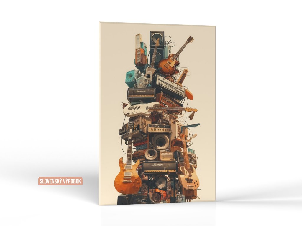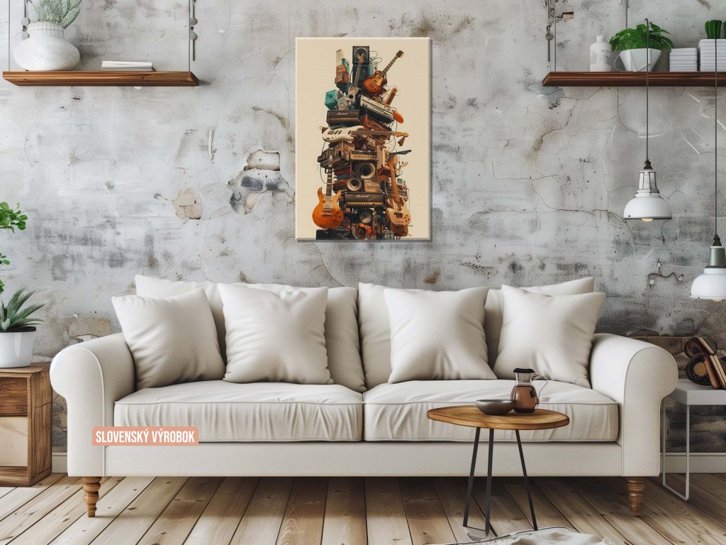 Tento obraz predstavuje originálnu vežu vytvorenú z rôznych hudobných nástrojov, zosilňovačov a reproduktorov, čím symbolizuje zmes hudobných žánrov a technológií. Zoskupenie gitár, zosilňovačov a ďalších zvukových zariadení vytvára dojem akustickej a vizuálnej harmónie. Výrazné kontrasty farieb a textúr dodávajú obrazu dynamiku a energiu, čím oslavuje kreativitu a hudobnú vášeň.