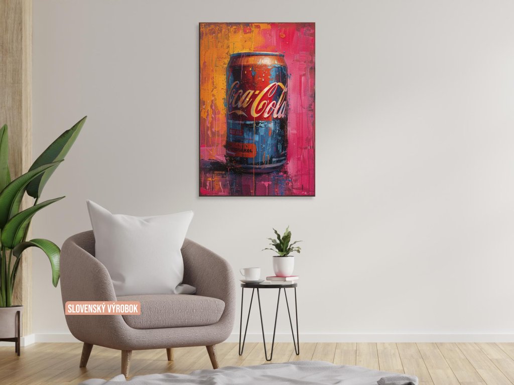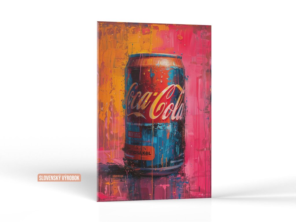 Tento obraz zobrazuje plechovku Coca-Coly v popredí s výraznými bodkami a škvrnami farby na pozadí. Pozadie je plné živých ružových a oranžových odtieňov s vertikálnymi stekajúcimi prvkami, ktoré pridávajú dynamiku a pohyb. Textúra a farby na obraze evokujú pocit spontánnosti a umenie street art.