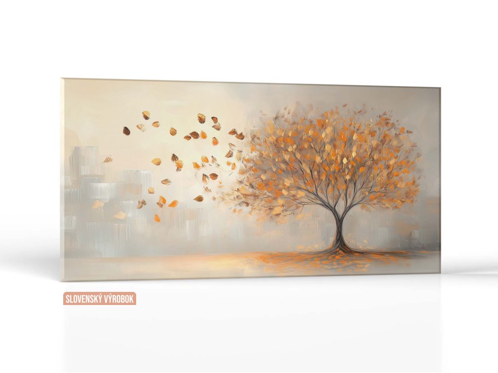 Obraz zobrazuje samostatný strom plný zlatých a oranžových listov, ktoré sa vznášajú vzduchom pod vplyvom jesenného vetra. V pozadí sa jemne rysuje silueta mesta, čo vytvára kontrast medzi prírodou a civilizáciou. Dielo vyžaruje jemnú melanchóliu, pripomínajúcu plynutie času a krásu pominuteľnosti.