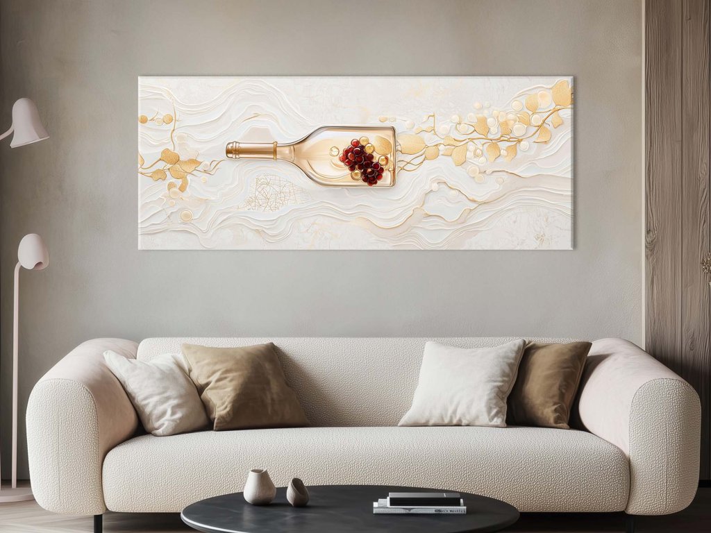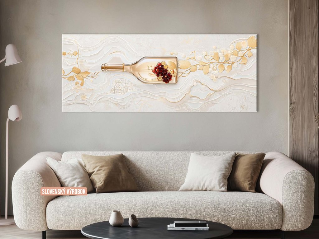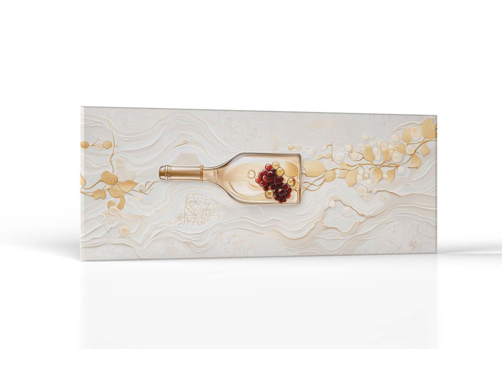 Tento obraz zachytáva priehľadnú fľašu vína s hroznom a zlatým viničom, ktorý sa vyníma na jemnom vrstvenom pozadí pripomínajúcom reliéfne línie krajiny. Zlaté detaily listov a vetiev vytvárajú elegantnú a harmonickú kompozíciu, ktorá pôsobí luxusne a esteticky. Abstraktné pozadie zvyšuje dojem umeleckej rafinovanosti, čím obraz vyzdvihuje spojenie prírody a kultúry vína.