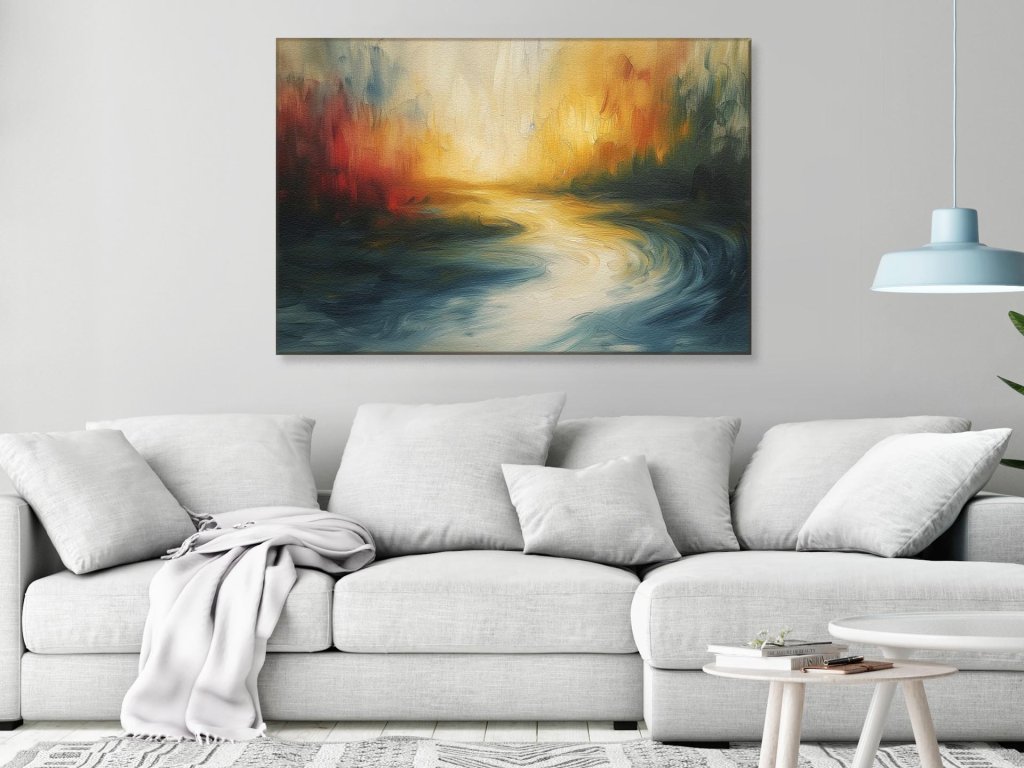 Tento obraz zachytáva dramatický pohyb a energiu prírodných elementov. Vnáša do diváka pocit tepla a pohybu, kde sa výrazné červené a oranžové tóny stretávajú s chladnými modrými a zelenými vlnami, čo vytvára ilúziu svetelného zdroja, ktorý rozptyľuje tmu. Kompozícia je plná života a pohybu, pričom každý ťah štetca prispieva k celkovej dynamickej a teplej atmosfé Obraz je interpretáciou prírodných síl, ktoré sú v neustálom toku.