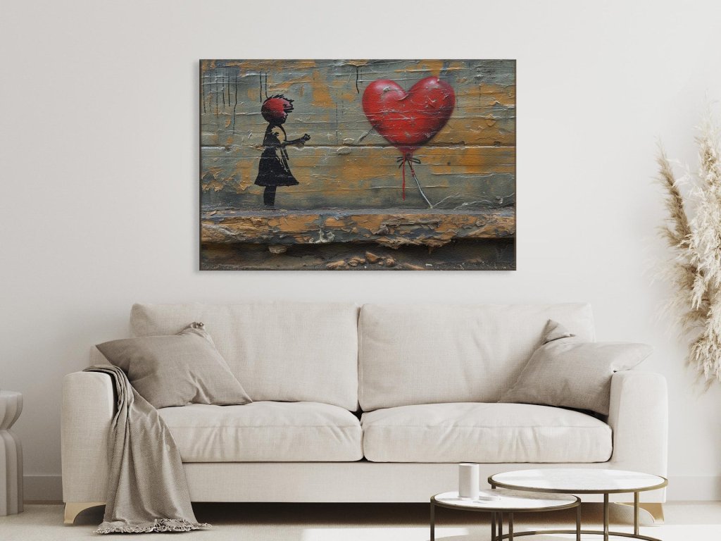 Na stene je nástenná maľba dievčatka, ktoré vo vítajúcom geste naťahuje ruky k balónu v tvare veľkého plného srdca. Srdce má textúru, ktorá pripomína skutočné maľované srdce s kvapkami farby, zatiaľ čo silueta dievčatka je zjednodušená a štylizovaná. Stena je zvetraná a ošúchaná, čo pridáva k umení patinu a starobu.
