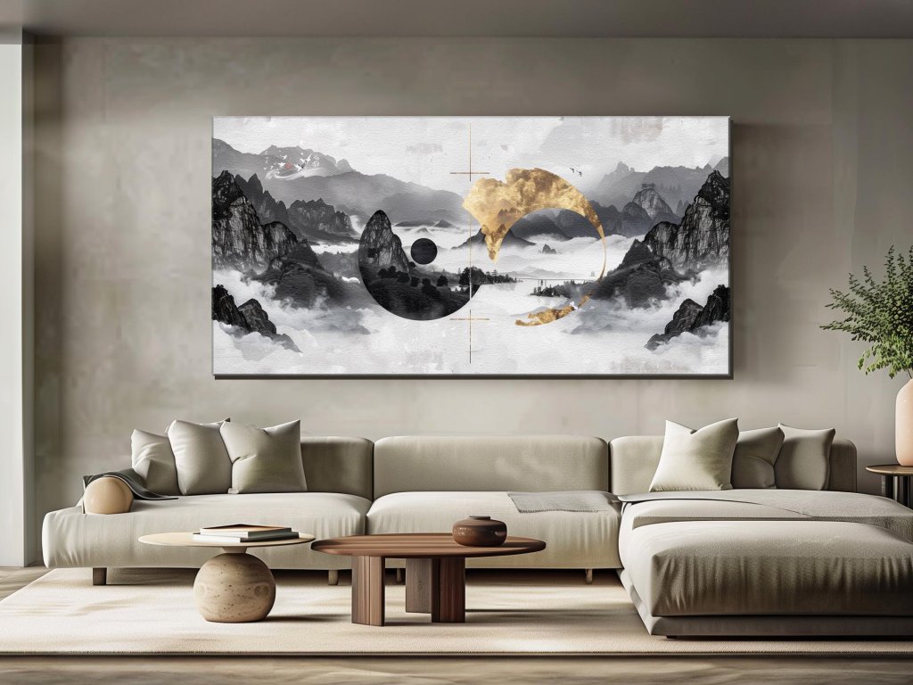 V tomto umeleckom diele sú zobrazené majestátne hory a mračná, ktoré sú akoby ponorené do ticha čiernobieleho sveta s výnimočnými zlatými detailmi, pridávajúcimi dielu hlbšiu vrstvu a dimenziu. Geometrické prvky a jemné línie vytvárajú pocit pokojnej symetrie a poriadku v divokej prírode. Celková atmosféra obrazu je pokojná a meditatívna, s nádychom tajomna a neobjavenej krásy.