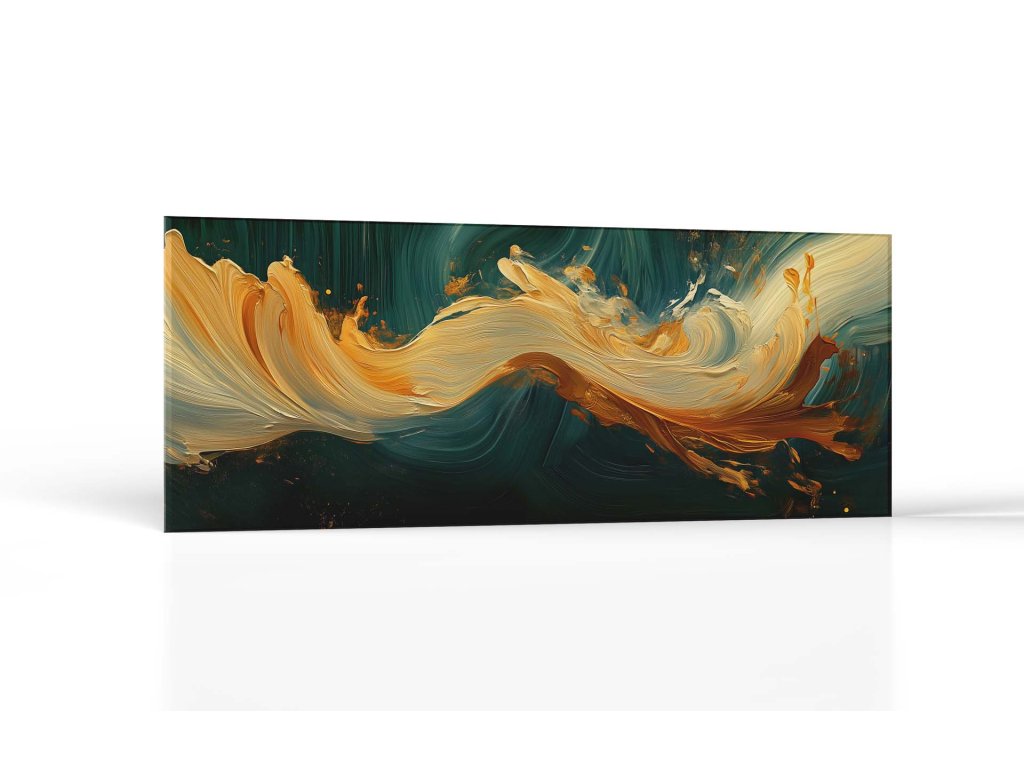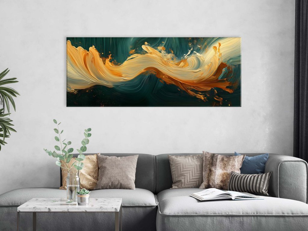 Obraz zachytáva abstraktnú vlnu zlatej a oranžovej farby, ktorá sa ladne vlní pred tmavým smaragdovým pozadím. Hladké a plynulé ťahy štetca vyvolávajú dynamiku a neustály pohyb, ako keby išlo o zachytený moment prírodného javu alebo neviditeľnej sily. Kontrast svetlých a tmavých tónov dodáva kompozíciu dramatického a podmanivého výrazu.