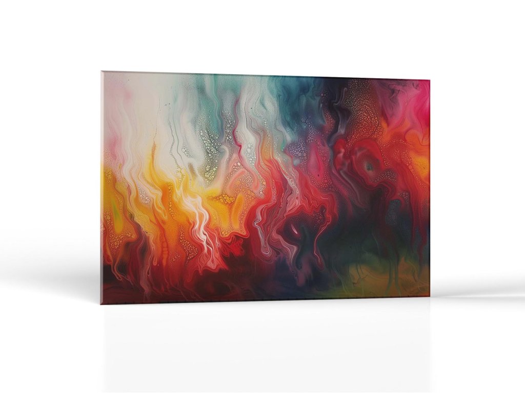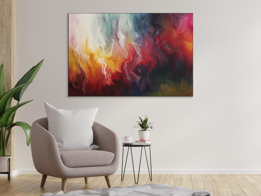 Na obraze sa prelínajú teplé a studené tóny v tvare vlniek a prúdov, ktoré vytvárajú hypnotizujúci vizuálny efekt. Živé červené a oranžové plochy kontrastujú so zelenými a modrými tónmi, vytvárajúc dojem hlbokosti a pohybu. Drobné vzory pripomínajúce bubliny dodávajú kompozícii štruktúru a dynamiku.