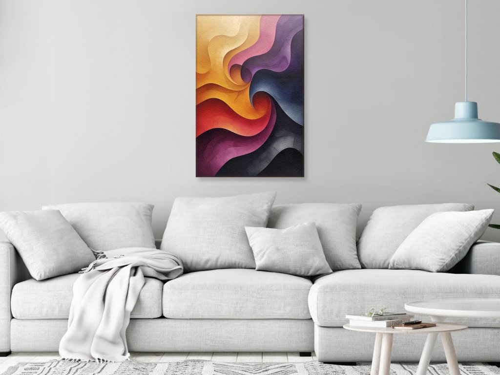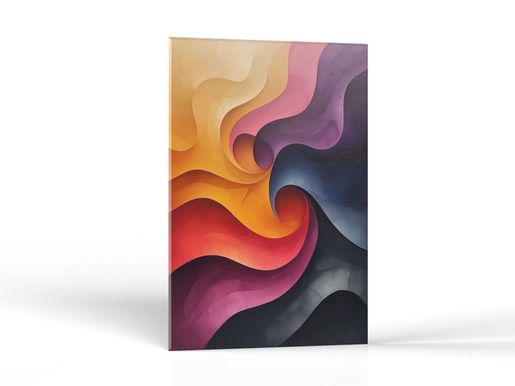 Abstraktný obrázok ukazuje sériu vlnitých, organických tvarov, ktoré prechádzajú z teplých oranžových do chladných fialových a čiernych tónov. Textúra na povrchu vytvára dojem pohybu a hĺbky, zatiaľ čo prelínanie farieb pôsobí harmonicky a uvoľnene. Vizuálny efekt je zároveň dynamický aj upokojujúci.