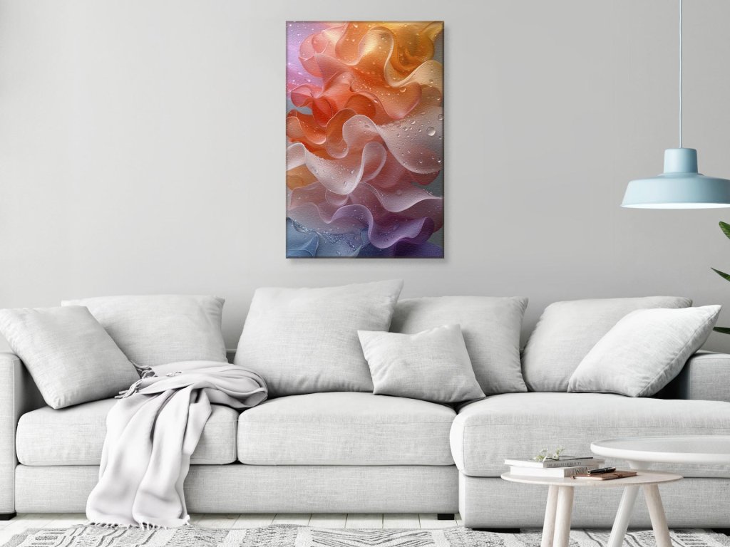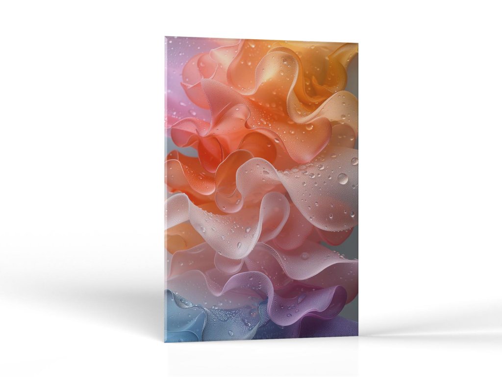 Obraz zobrazuje abstraktné vrstvy, ktoré pripomínajú mäkké kvetinové lístky v jemnom prechode farieb od teplých oranžových až po chladné modré tóny. Na ploche sú viditeľné drobné kvapky vody, ktoré zvýrazňujú textúru a dodávajú obrazu pocit čerstvosti a trojrozmernosti. Dynamika farieb a voda vytvárajú pocit pohybu a života.