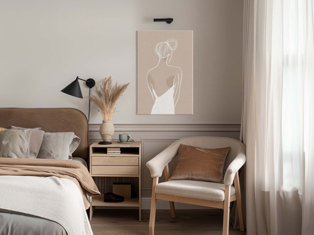 Tento obraz zobrazuje elegantnú a jemnú siluetu ženy, ktorá je zobrazená od chrbta. Jemné línie a minimalistický štýl zdôrazňujú krásu a pôvab ženského tela, pričom pozadie v neutrálnych tónoch dodáva obrazu pokoj a harmóniu. Celkový dojem obrazu je tichý a sofistikovaný, vnášajúc do priestoru pocit elegancie a jemnosti.
