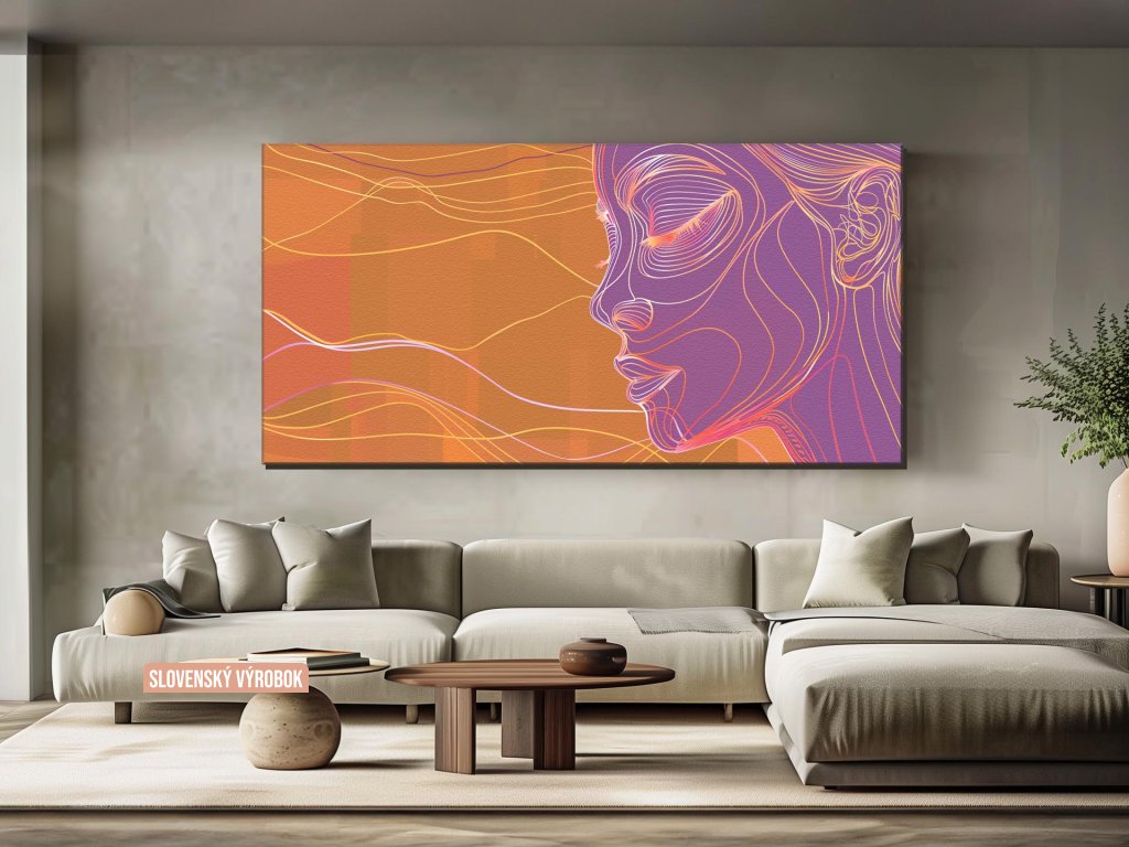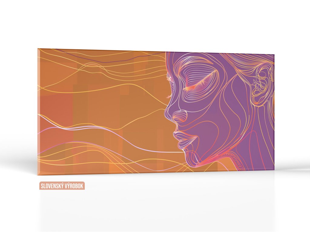 Obraz ukazuje profil ženy, zobrazený pomocou kontúrnych línií v teplých oranžových a fialových odtieňoch na oranžovom pozadí. Dynamika a hĺbka sú dosiahnuté vrstvením priehľadných líniových štruktúr, ktoré dotvárajú detaily tváre a vlasov. Celková kompozícia vytvára zmyselný a moderný vizuálny dojem.