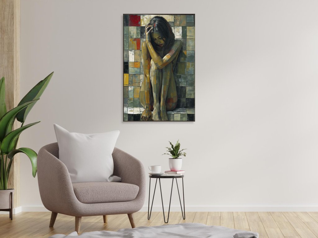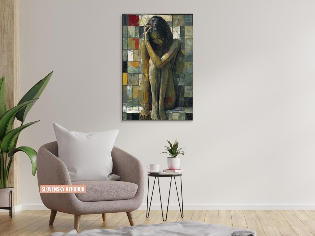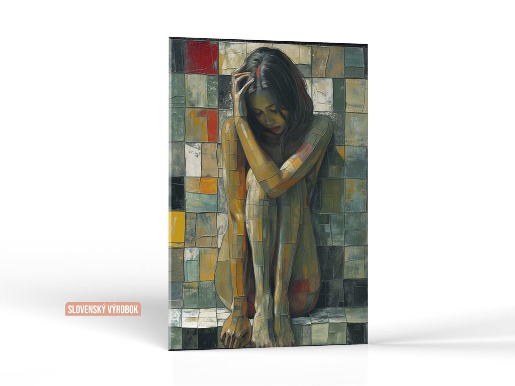 Obrázok zachytáva sediacu ženu s hlavou opretou o ruku, jej telo a pozadie majú mozaikovú textúru. Farby na obraze sú jemne zemité s výraznými oranžovými a šedými tónmi. Kompozícia evokuje melancholickú náladu a pôsobí introspektívne.