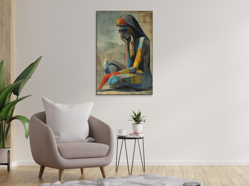 Obraz predstavuje sediacu ženskú postavu, ktorej tvár a telo sú zložené z geometrických farebných segmentov. Na pozadí je abstraktné a pritom harmonické prostredie, ktoré vytvára pocit ticha a introspekcie. Farby sú intenzívne a odvážne, no sú vyvážené tak, aby vytvorili ucelený a emotívny výraz.