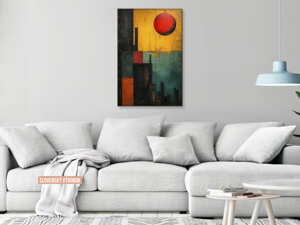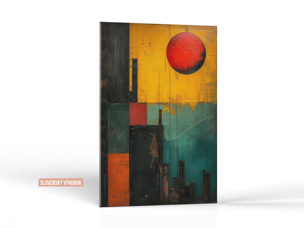 Abstraktný obraz s červeným kruhom nad geometrickými tvarmi.