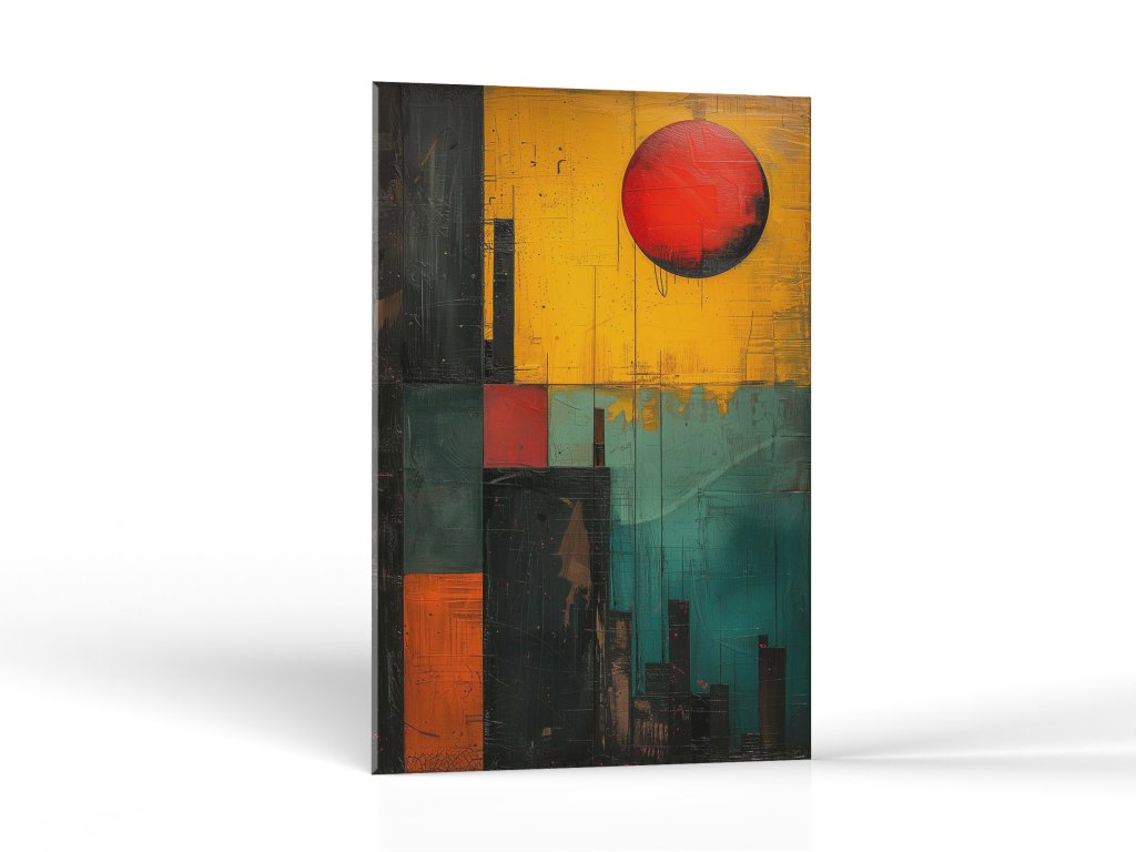 Tento obraz využíva silné kontrasty medzi žiarivými a tmavými odtieňmi, pričom červený kruh na hornej časti obrazu pôsobí ako slnko alebo svetlo nad mestskými štruktúrami. Hrubé, náhodné škrabance a stopy na povrchu vytvárajú dynamický a textúrovaný vzhľad. Vizuálne to pripomína západ slnka nad mestom s abstraktným a moderným umeleckým výrazom.