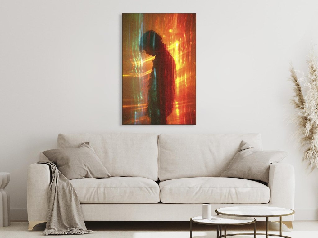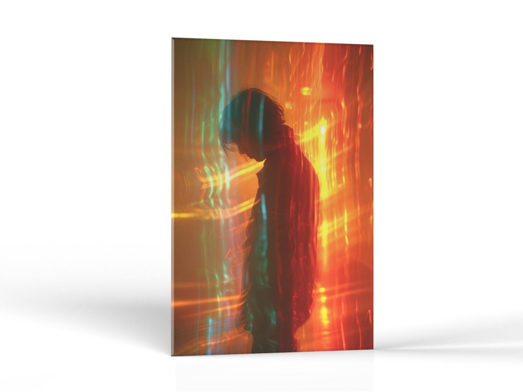 Na tomto umeleckom obraze je postava ponorená v mystických svetelných valoch, ktoré vytvárajú dojem hnutia a energie okolo nej. Farebné svetelné prúdy prechádzajú od teplých oranžových tónov po chladné zelené, vytvárajúc kontrastné vizuálne spektrum. Postava stojí pokorne so sklonenou hlavou, akoby bola úplne pohltená magickým momentom.
