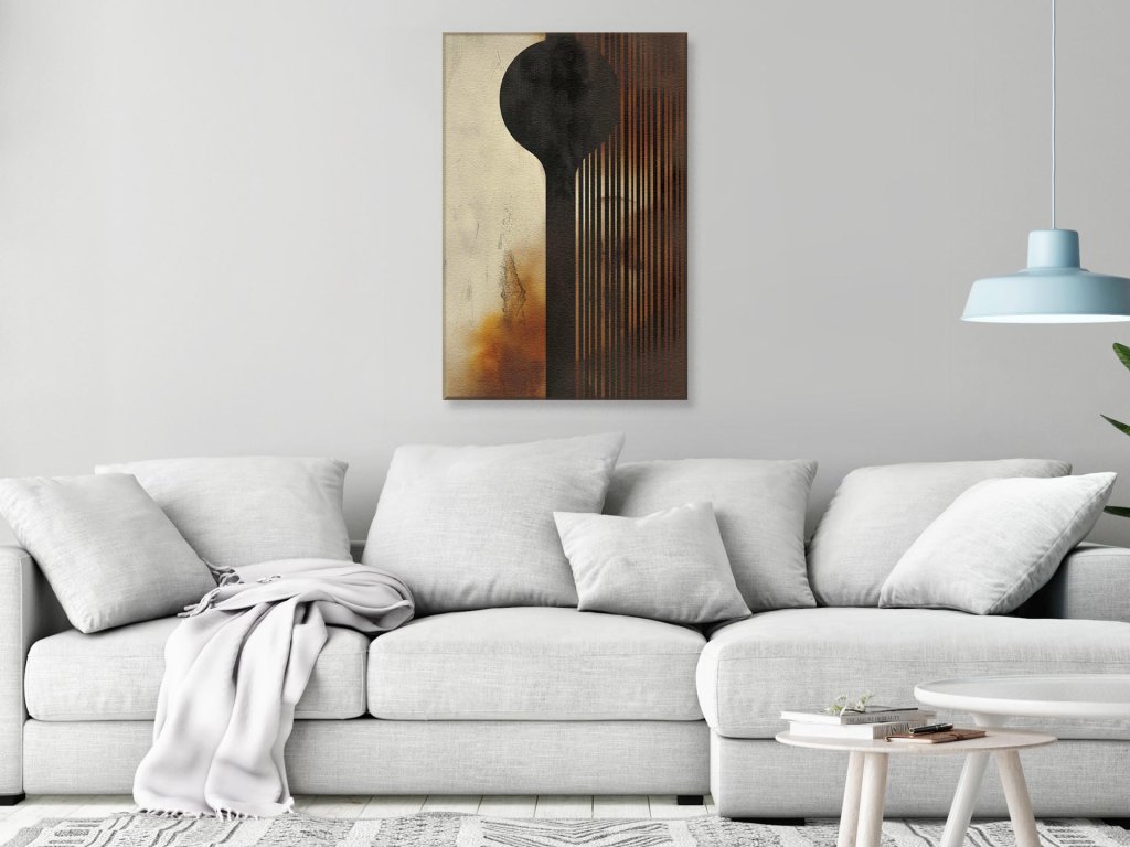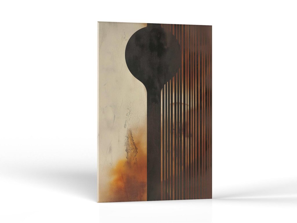 Umelecké dielo predstavuje siluetu v abstraktnej forme s prvkami, ktoré pripomínajú pruhy alebo mreže, rozprestierajúce sa cez celý obraz. Tmavé odtiene prechádzajúce na svetlejšie tóny spolu s akcentmi oranžovej a vytvárajú pocit hĺbky a záhadnosti. Vizuálny efekt je zosilnený kontrastnými líniami a textúrou, ktorá pripomína zrnitosť starého filmu alebo nástennú maľbu.